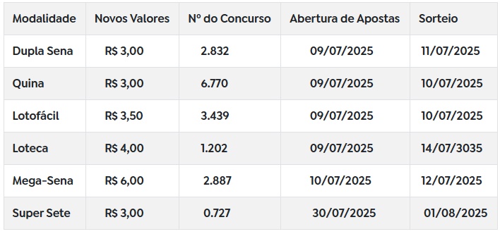 • Quina, Lotofácil, Dupla Sena e Loteca: novos preços a partir de 9 de julho;