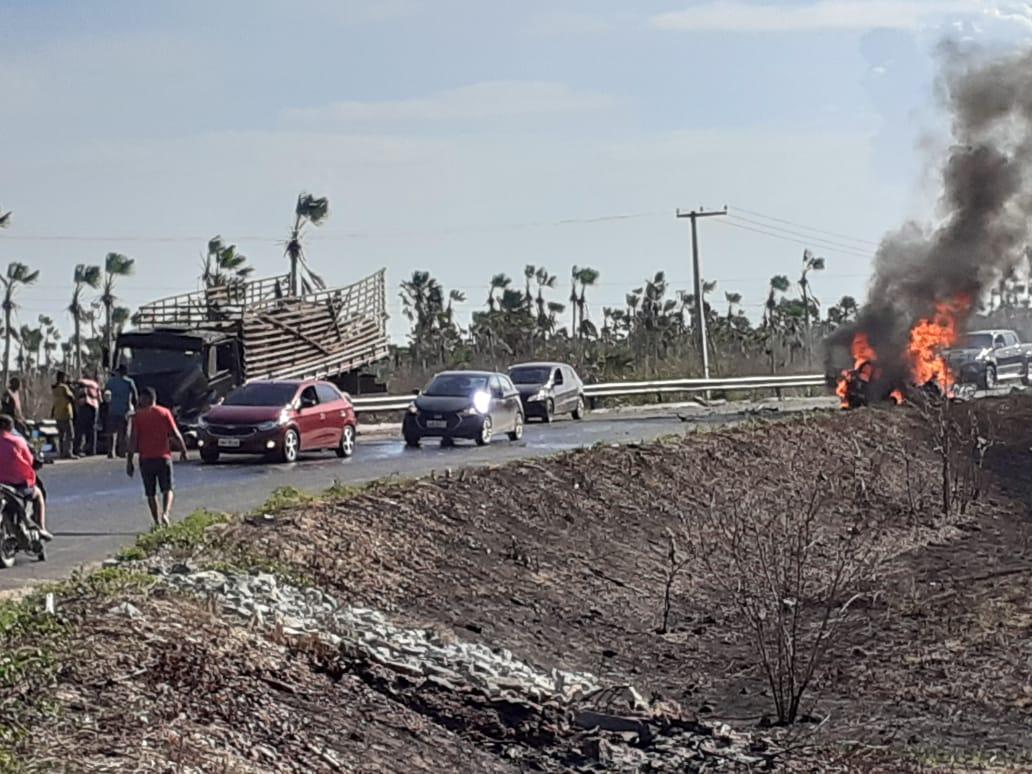 Uma mulher, o filho de 11 anos e outras duas pessoas morreram carbonizados após o carro em que estavam pegar fogo ao colidir de frente com um caminhão no quilômetro 225 da CE-085, no município de Acaraú, na tarde desta quinta-feira (27). Uma quinta pessoa que estava no veículo sobreviveu e foi socorrida para um hospital da região.