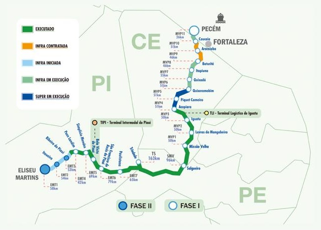 O avanço vem se somar à Fase I do projeto, que liga Paes Landim (PI) ao Porto do Pecém (CE) e já alcançou 79% de execução física.