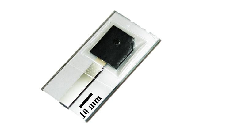 O dispositivo que detecta a Covid-19 é composto por uma pequena peça de vidro (aproximadamente, 5,5 cm x 2,5 cm) com um papel condutor de corrente elétrica, como você pode ver na imagem abaixo.