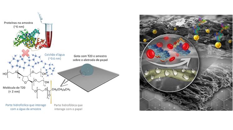Além de proteger o eletrodo contra contaminação — especialmente de proteínas presentes no soro sanguíneo que podem influenciar nas medidas da análise— a nanocamada de T20 permite que uma parte do volume da gota da amostra penetre gradualmente nos poros do papel, como ilustra a figura abaixo.