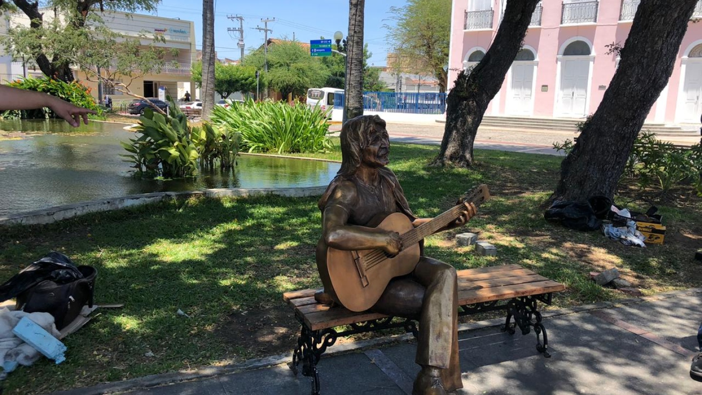 A peça foi encomendada para a celebração do aniversário do cantor e ficará em exposição permanente na praça do Theatro São João, sendo mais um fator de atração turística para o município (Foto: Maristela Gláucia)