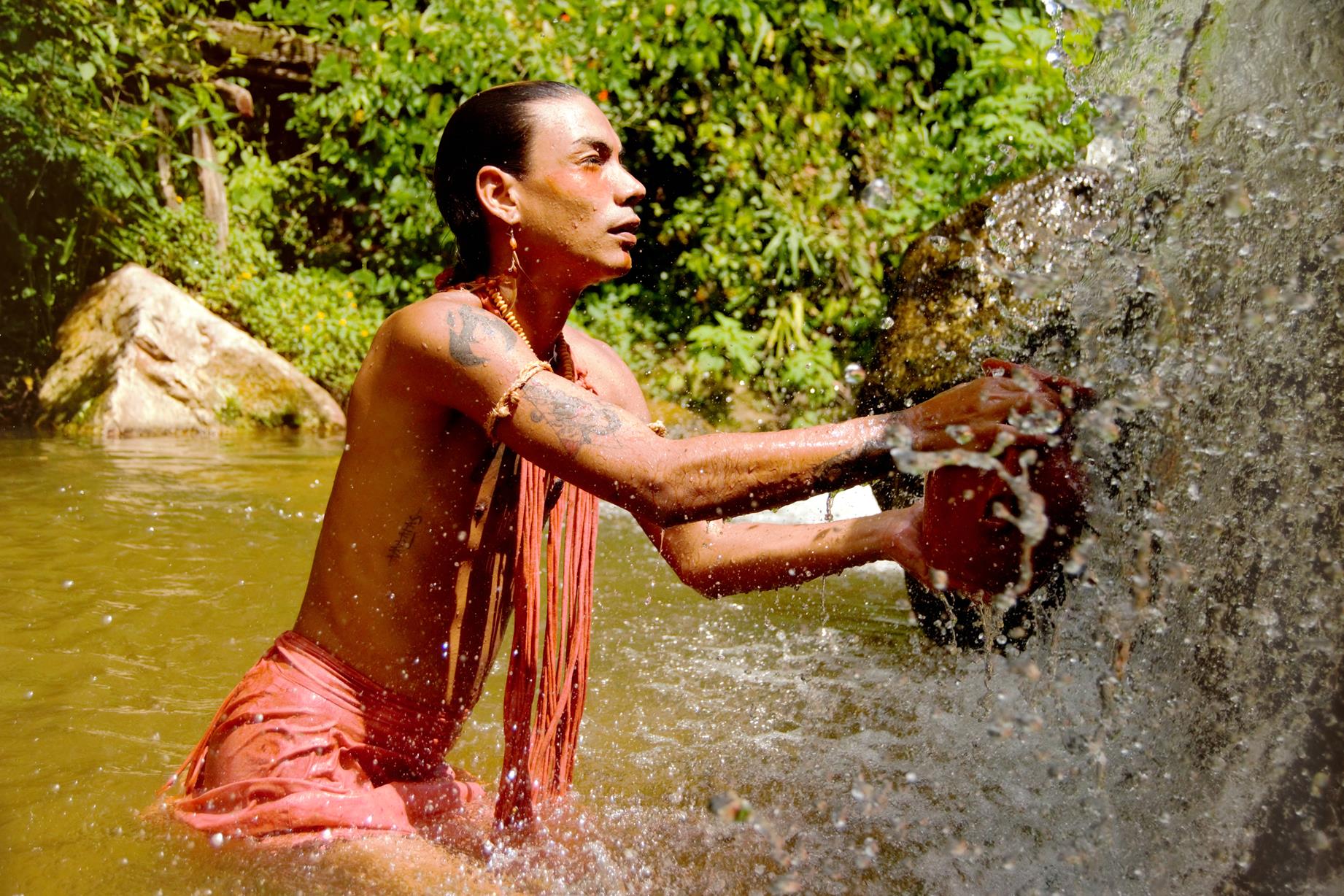 Durante a apresentação, Indja saúda Tupã e os ancestrais indígenas em língua Kariri-Xocó, utiliza urucum como símbolo de proteção e memória, e se banha com a mistura vermelha, que também representa o sangue derramado pelos corpos indígenas ao longo da história.
