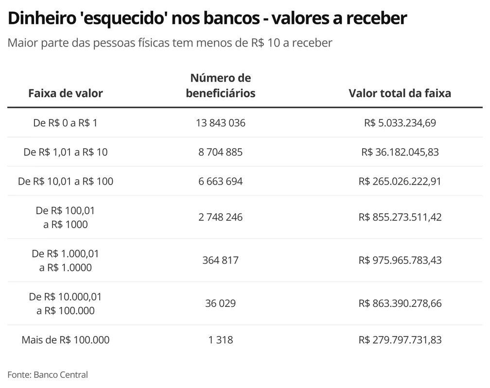 Quase 14 milhões de brasileiros com dinheiro ‘esquecido’ nos bancos têm no máximo R$ 1 a receber, segundo dados divulgados pelo Banco Central nesta segunda-feira (14). Outros 8,7 milhões têm entre R$ 1,01 e R$ 10 (veja mais abaixo a tabela completa de valores).
