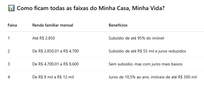 As famílias de menor renda (Faixas 1 e 2) agora também poderão financiar imóveis com o teto da Faixa 3 (até R$ 350 mil), porém sem subsídios, e com as seguintes taxas de juros: