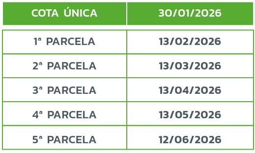 • 5% de desconto no pagamento em cota única até 30 de janeiro de 2026;