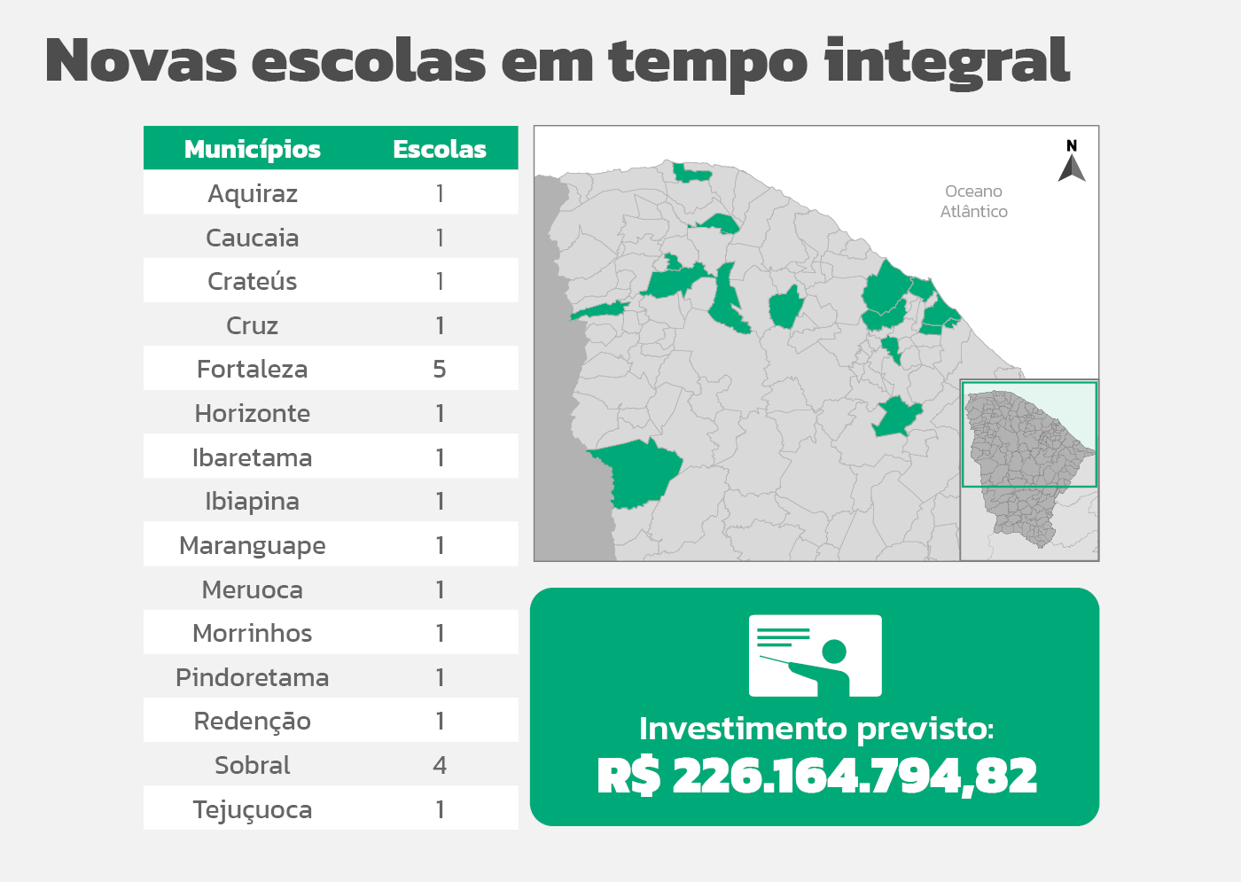 A construção de 22 escolas beneficiará estudantes de 15 municípios cearenses. O investimento previsto é de R$ 226.164.794,82, com recursos oriundos Fundo de Manutenção e Desenvolvimento do Ensino Fundamental e de Valorização do Magistério (Fundef).