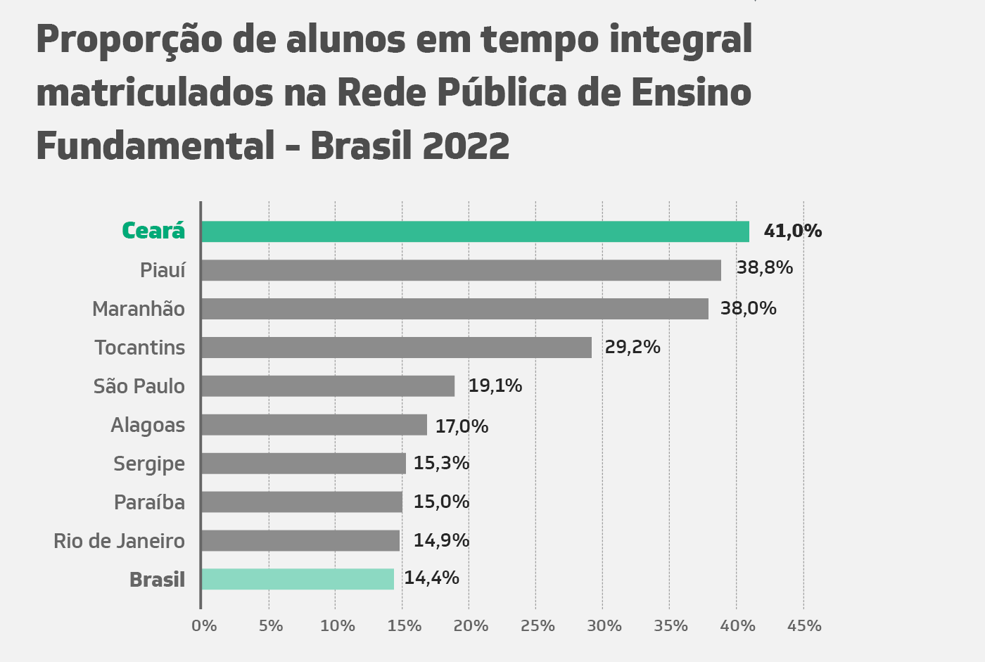 O Ceará possui a maior proporção de alunos em tempo integral matriculados na rede pública de ensino fundamental em todo o Brasil. Com 41%, o percentual é maior do que a média apresentada pelo país, que é de 14,4%. O dado faz parte do Censo Escolar da Educação Básica 2022, divulgado pelo Ministério da Educação (MEC) nesta quarta-feira (8).