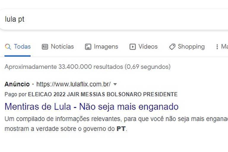 Na segunda-feira (13), um link acompanhado da frase “Mentiras de Lula— Não seja mais enganado” aparecia em destaque como conteúdo impulsionado no Google ao se buscar os termos “Lula PT” e “Lula Tópicos”. O link direcionava o usuário para o site “Lulaflix: Conheça a verdade sobre o ex-presidiário”.