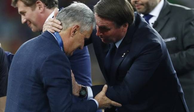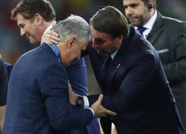 O técnico Tite, que em outras oportunidades afirmou que não gostaria de visitar Jair Bolsonaro em caso de título da seleção na Copa América, foi evasivo tanto na hora de cumprimentar o presidente quanto ao falar sobre sua presença no gramado com os jogadores. Na entrevista coletiva depois da final, um representante da organização do torneio tentou censurar pergunta a respeito do tema, alegando que jornalistas deveriam tratar apenas sobre a competição. Tite foi breve ao responder o questionamento: “Sei que isso acontece”, disse, referindo-se genericamente ao envolvimento de políticos e autoridades em comemorações de título. “Mas fico tão envolvido no futebol que isso não me afeta. Meu foco é no futebol, dentro do campo. É nisso que eu fico envolvido. As outras situações ficam à parte.” O treinador não saiu na foto com Bolsonaro.