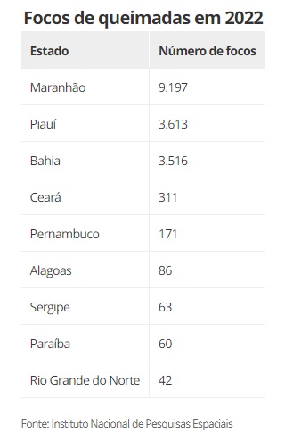 Em primeiro lugar aparece o Maranhão com 9.197 focos, seguido pelo Piauí (3.613 focos) e Bahia (3.516).