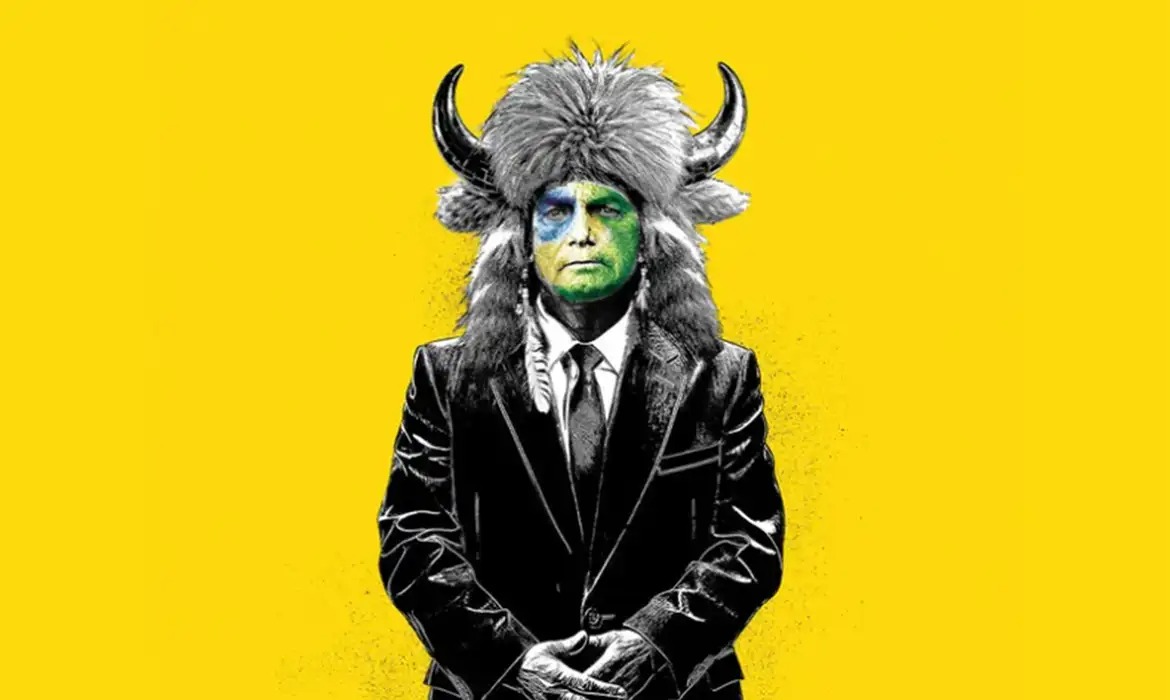 Na capa, Bolsonaro aparece com o rosto pintado com as cores da bandeira nacional e usando um chapéu semelhante ao de Jake Angeli, conhecido como o “xamã do Capitólio”, que ficou famoso por sua participação na invasão ao Congresso dos Estados Unidos em 2021, em apoio a Donald Trump.