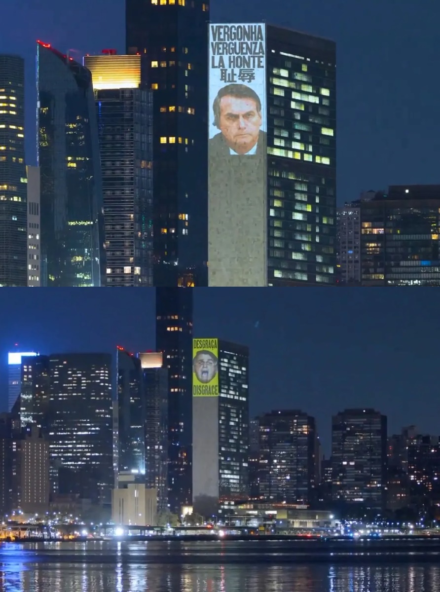 Na madrugada desta terça-feira (20), horas antes de o presidente Jair Bolsonaro discursar na 77ª Assembleia Geral da Organização das Nações Unidas (ONU), uma série de imagens com rosto de Bolsonaro e críticas a ele foi projetada na fachada lateral do prédio da ONU em Nova York.