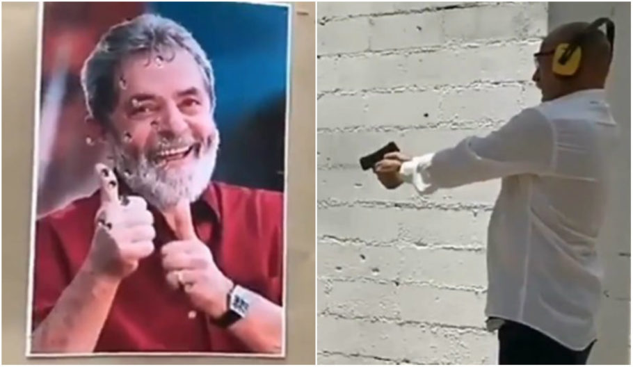No vídeo registrado em uma rede social, ele fez dez disparos seguidos com sua pistola em uma imagem sorridente de Lula.