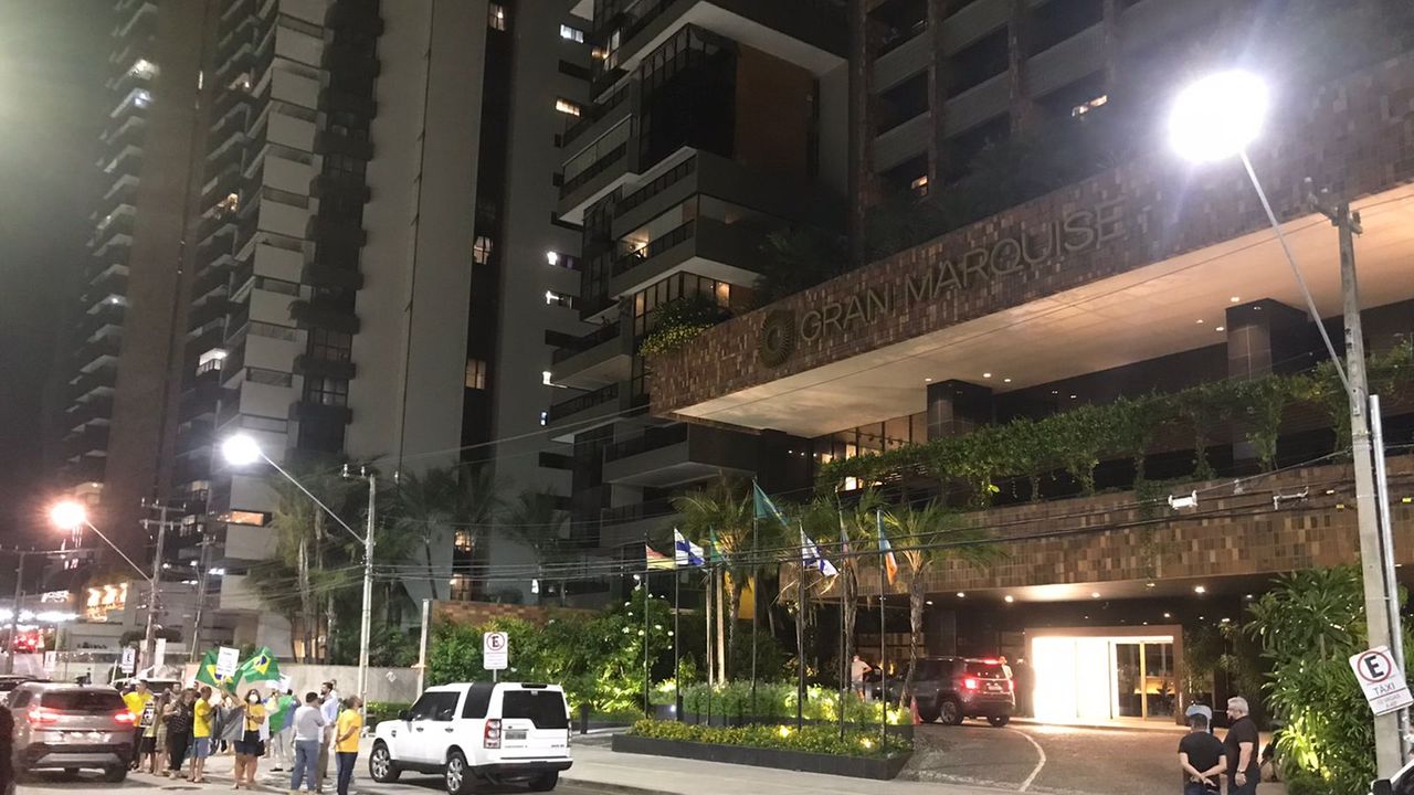 Vestidos de verde e amarelo, um pequeno grupo de apoiadores do atual presidente se reuniu em frente ao hotel com bandeiras do Brasil e faixas com os dizeres “Lula ladrão”.