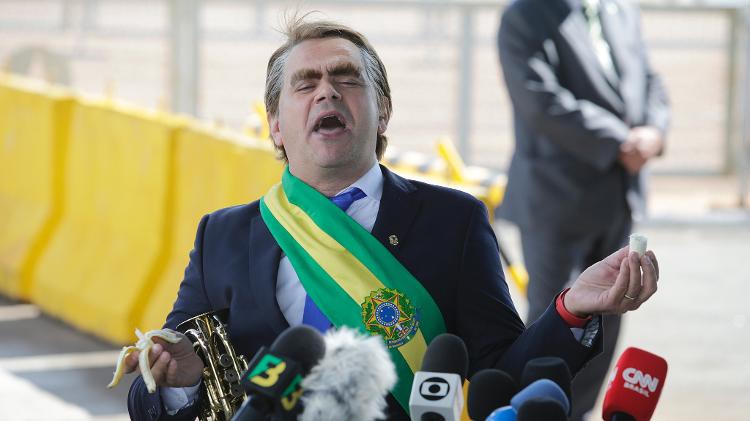 O humorista queria que os repórteres fizessem perguntas a ele. “Aqui é o presidente fake. Aproveita!”, disse. Não houve questionamentos.