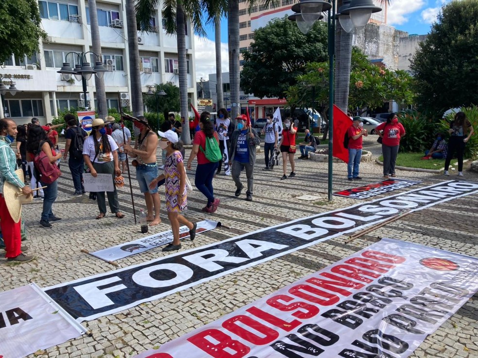 Manifestantes foram às ruas na manhã deste sábado (3) para protestar no Ceará contra o governo do presidente da República Jair Bolsonaro (sem partido) e em defesa da vacinação contra a Covid-19.