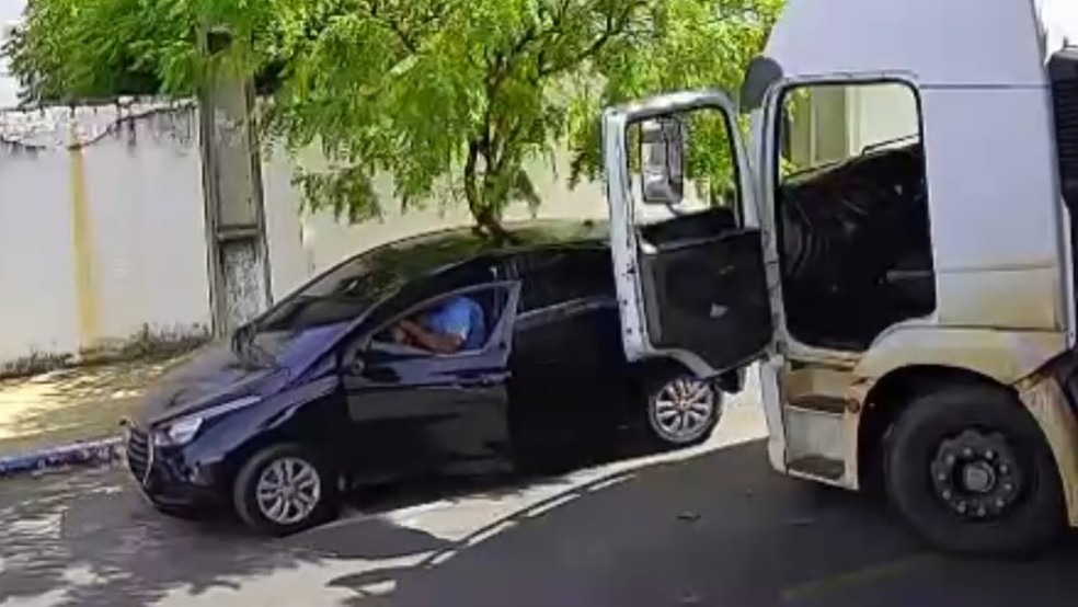 Um motorista de caminhão foi flagrado quebrando o vidro de um carro estacionado para tentar liberar espaço e realizar uma conversão em Barbalha. O caso aconteceu na última quinta-feira (13) e foi registrado por câmeras de monitoramento.