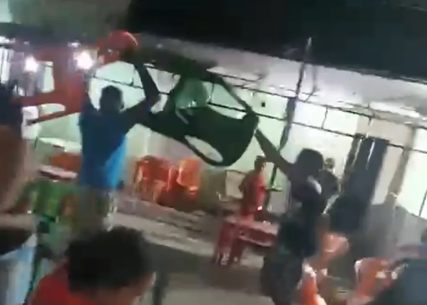 A briga e a confusão generalizada foram filmadas. Um homem é agredido com pancada de cadeira na cabeça. Há também muita gritaria e correria.