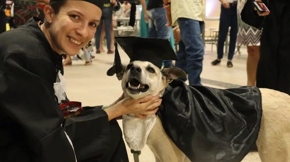 Valente, de apenas sete anos, foi a estrela da noite entre os formandos de uma turma Administração da Universidade Federal do Cariri (UFCA). Ela é uma cadelinha vira-lata, que vive no campus da universidade, e foi madrinha de formatura de Fernanda Bastos, ativista da causa animal.