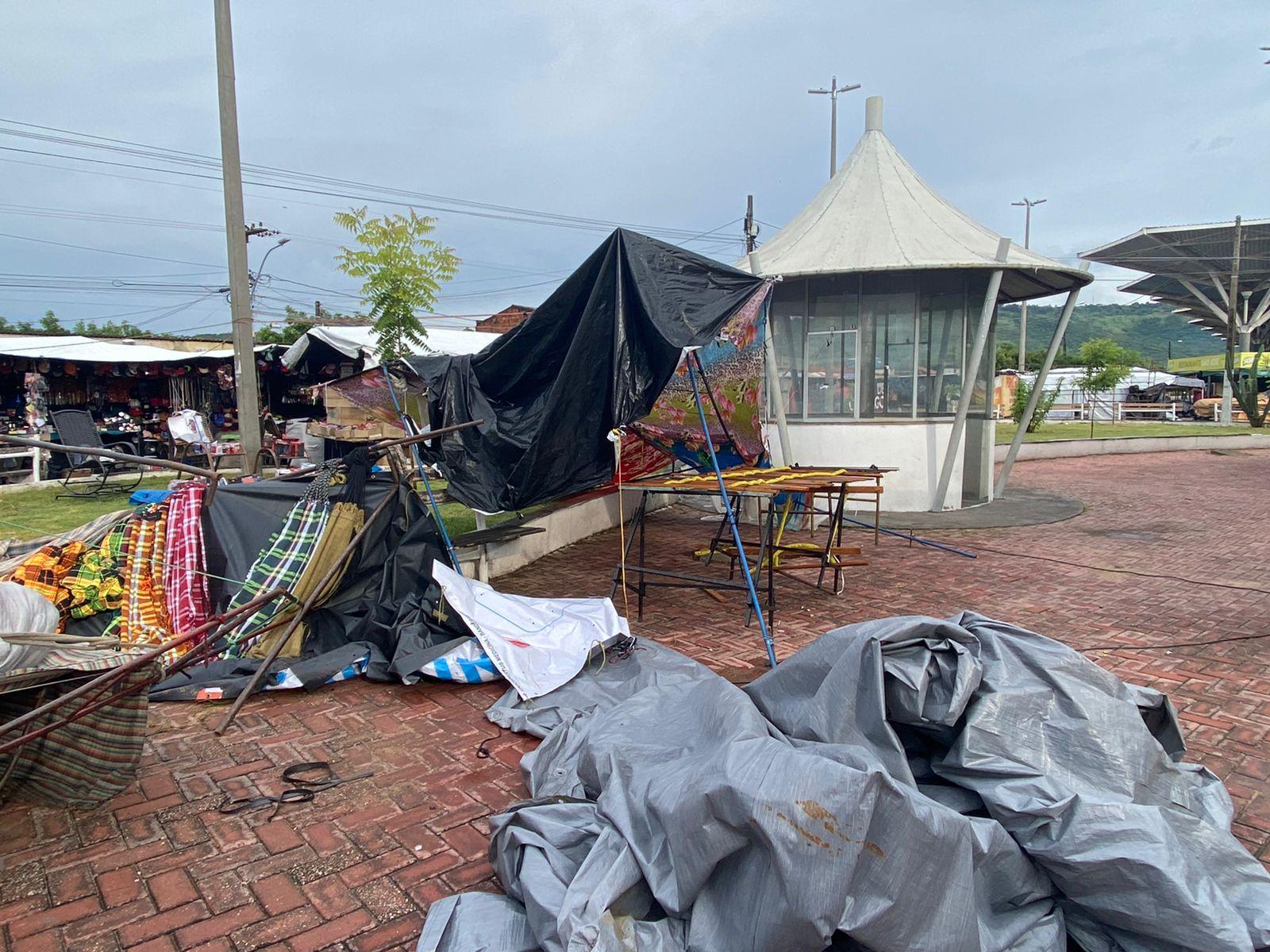 Barracas de roupas, eletrônicos e artigos religiosos montadas em frente ao Centro de Apoio aos Romeiros, em Juazeiro do Norte, foram atingidas pela chuva e amanheceram danificadas nesta sexta-feira (28). A estrutura de ferro e a lona vieram abaixo porque não suportaram o volume de água que caiu nas últimas horas.