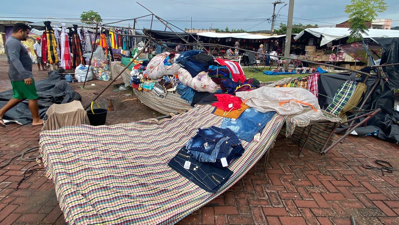 Barracas de roupas, eletrônicos e artigos religiosos montadas em frente ao Centro de Apoio aos Romeiros, em Juazeiro do Norte, foram atingidas pela chuva e amanheceram danificadas nesta sexta-feira (28). A estrutura de ferro e a lona vieram abaixo porque não suportaram o volume de água que caiu nas últimas horas.