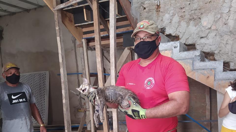 Antes da chegada da equipe do Corpo de Bombeiros, os policiais ainda identificaram o local onde o gato estava. “Foi preciso ficar em silêncio, usar bem a audição, para não quebrar a casa todinha. Ontem, ainda quebramos parte da calçada e deixamos aberto para entrar mais ar e manter a respiração”, descreve Neto.