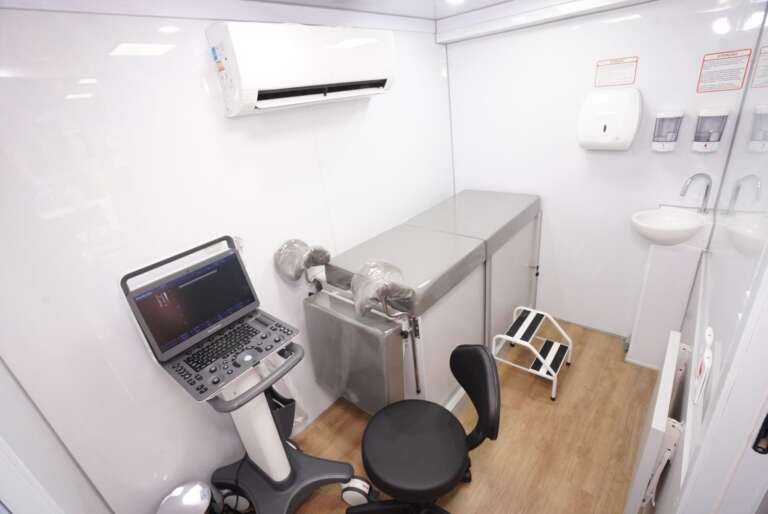 O consultório ginecológico móvel possui ambiente climatizado e equipamentos modernos para realizar diagnósticos com segurança e rapidez.