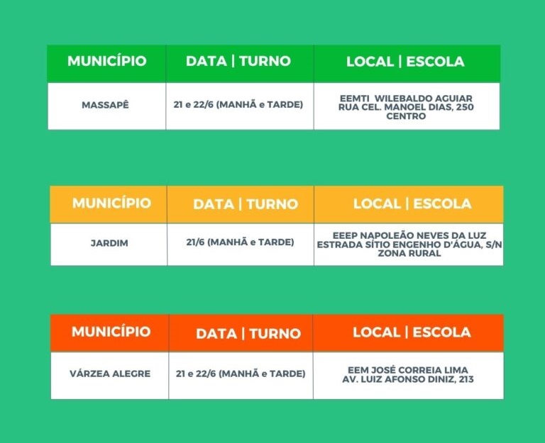 O Departamento Estadual de Trânsito do Ceará (Detran-CE) anunciou que realizará atendimentos do programa CNH Popular nos municípios de Várzea Alegre, Jardim e Massapê, nos próximos dias 21 e 22 de junho. A ação contempla candidatos com inscrição aprovada nas edições de 2023 e 2024.