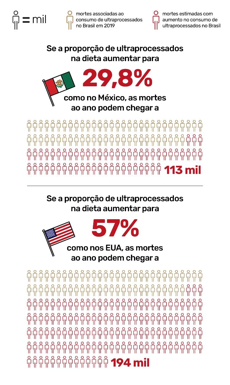 Com o mesmo modelo utilizado na pesquisa, Nilson já fez estimativas nesse sentido. Se o Brasil se igualar ao México, onde a participação calórica de ultraprocessados é de 29,8%, as mortes atribuíveis a esse consumo podem praticamente dobrar, chegando a 113 mil.
