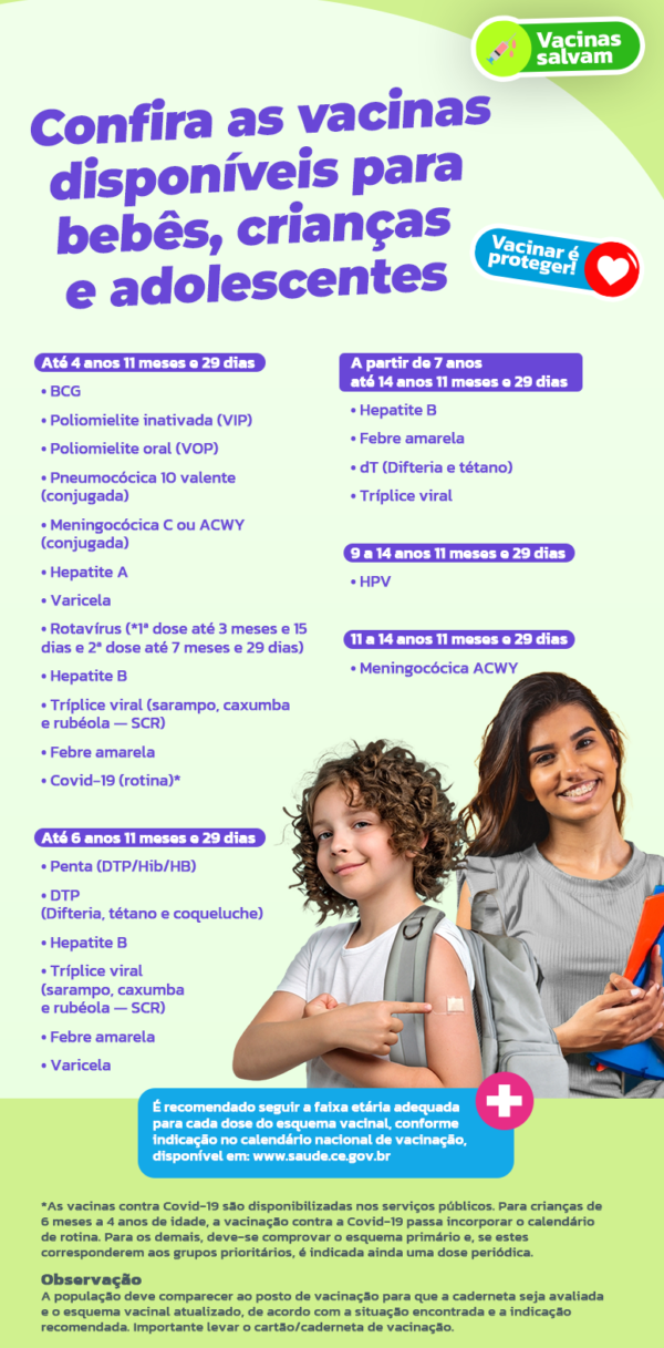 A Saúde do Ceará recomenda aos municípios a realização de Dias D mensais para estimular a atualização da caderneta de vacinação. Neste mês, tendo em vista o retorno das atividades escolares, a data sugerida para a mobilização é no dia 27 de janeiro. Para receber o imunizante, a população deve buscar os locais de vacinação de acordo com a programação de sua cidade. Já durante a semana, a recomendação é buscar o posto de saúde mais próximo de casa e atualizar o esquema vacinal.