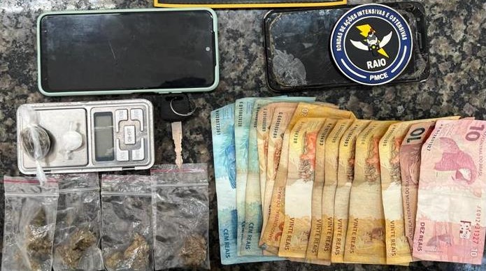 Um homem de 24 anos e uma mulher de 19 foram presos por volta do meio-dia desta sexta-feira (29), em Crato, após serem flagrados por policiais do BPRaio na posse de seis papelotes de maconha, um de cocaína, uma balança de precisão, uma quantia de 560,00 reais em espécie e uma motocicleta Honda CG 160 Start de cor preta, com a placa PNG-9D34.