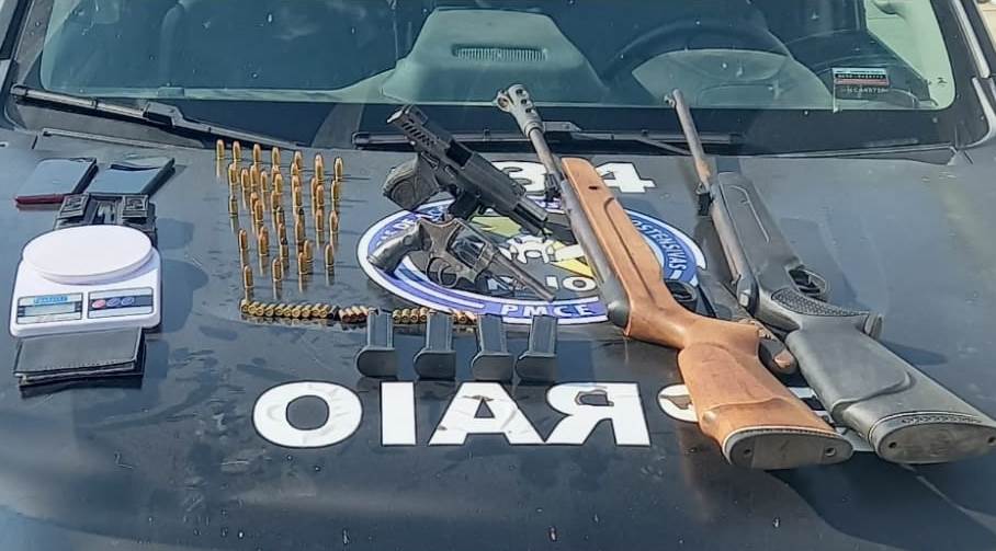 Durante a ação os policiais apreenderam um veículo Volkswagen modelo Gol 1.0 GIV, de cor branca, e placas JKK-7066/DF; um revólver, calibre 32; uma pistola, calibre 380; cinco carregadores para pistola 380; cinquenta e oito cartuchos calibre 380, intactos; três cartuchos calibre 32, intactos; três cartuchos calibre 32, deflagrados; duas espingardas de pressão, calibre 5.5; dois portas carregadores; dois aparelhos de telefonia celular; uma balança de precisão; uma quantia de R$ 4.230,00 (quatro mil, duzentos e trinta reais) em espécie; um relógio; um boné; onze camisas, de cores e marcas diversas; quatro shorts jeans; e duas calças jeans.