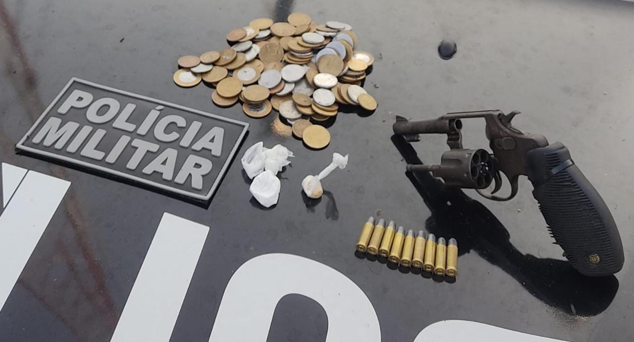 Um dos indivíduos, ao ver os policiais jogou uma bolsa no chão da cozinha. Os militares ao verificarem o objeto, constataram ter no interior um revolver calibre 32, nove cartuchos calibre 38 intactos, três gramas de cocaína e uma de crack.