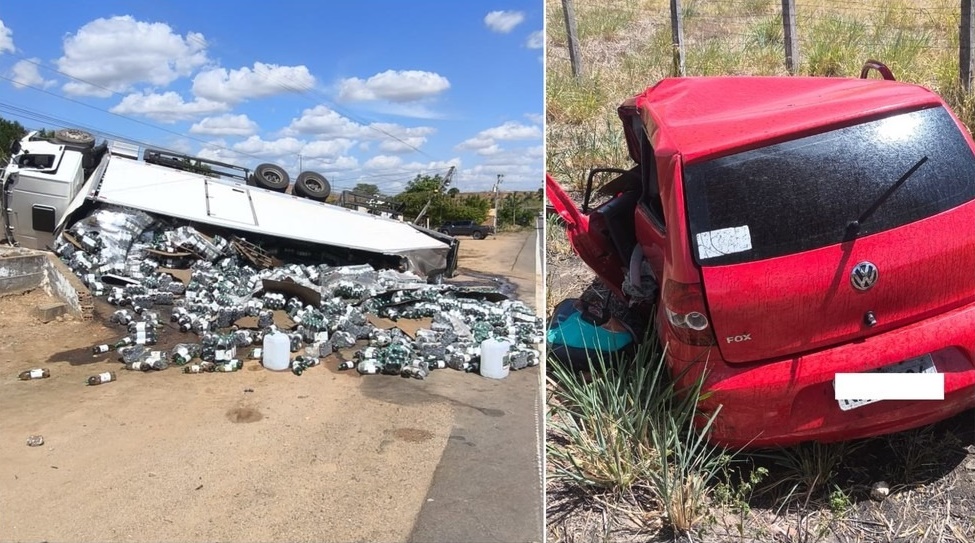 Com o impacto da batida, os dois veículos saíram da pista. O caminhão tombou e a carga de refrigerantes ficou espalhada pela via, dificultando o tráfego no local.