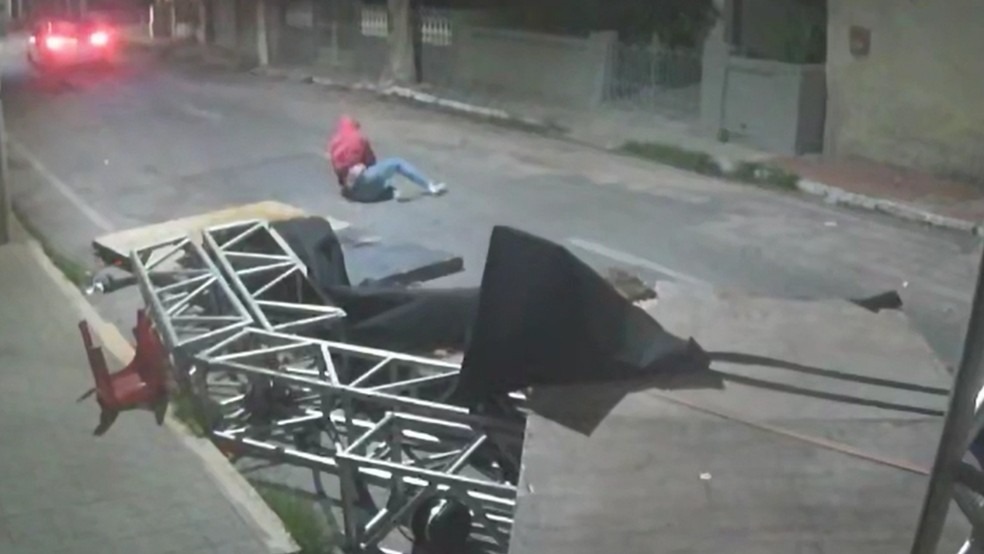 Vídeos de câmeras de segurança mostram o instante em que o carro invade o espaço e arrasta parte da estrutura, derrubando equipamentos montados para o evento.