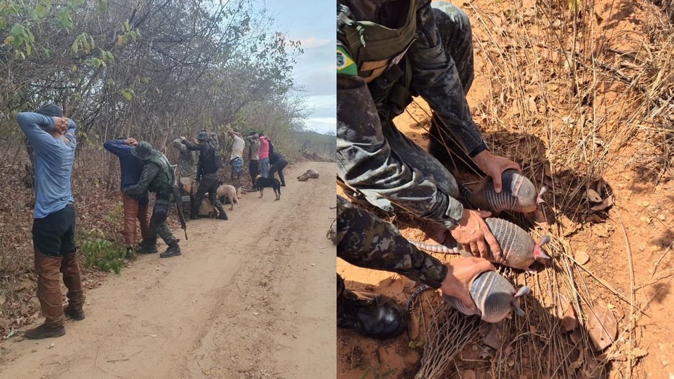 Durante a fiscalização, foram presos oito homens, com idades entre 19 e 35 anos — sete da Paraíba e um do Ceará. O grupo foi flagrado com quatro tatu-galinhas e cães treinados para a caça.