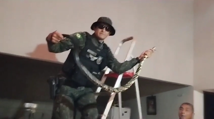 Uma composição do Batalhão de Polícia de Meio Ambiente (BPMA), da PMCE, foi acionada por meio da Coordenadoria Integrada de Operações de Segurança (Ciops), da Secretaria da Segurança Pública e Defesa Social (SSPDS), para realizar o resgate de uma serpente. Na ocasião, o animal foi encontrado na parte interna do telhado de uma residência, no Bairro Vila Santo Antônio.