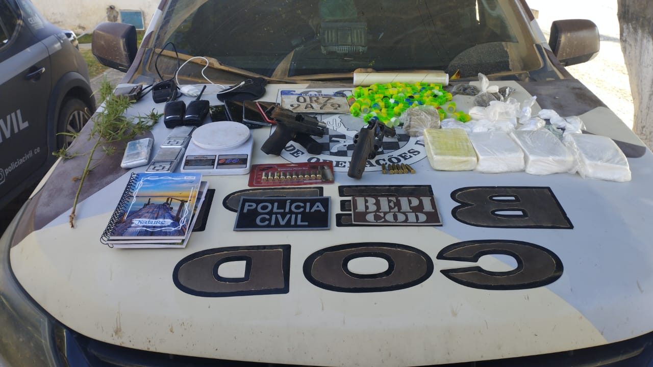 Três homens foram presos em flagrante, nesta quarta-feira (20), durante uma operação conjunta da Polícia Civil do Estado do Ceará (PCCE) e da Polícia Militar do Ceará (PMCE) no município de Assaré. O grupo foi autuado pelos crimes de tráfico de drogas, posse ilegal de arma de fogo e receptação.