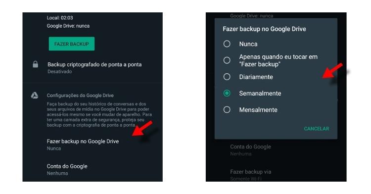3. Na opção “Fazer backup no Google Drive”, você pode decidir se vai fazer backup mensalmente, semanalmente ou diariamente de maneira automática.