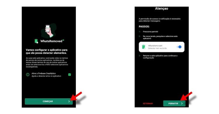 1. Na tela inicial do WhatsRemoved+, vá em “Começar”. Depois, habilite o acesso do app às notificações, clicando em “Permitir”;