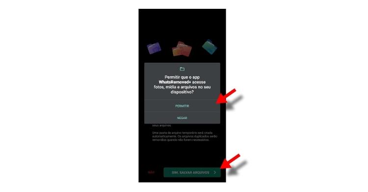 3. Em “Você deseja detectar e salvar arquivos excluídos?”, toque em “Sim. Salvar arquivos”. Ainda na mesma tela, conceda permissão para acessar fotos, mídia e arquivos no seu celular;
