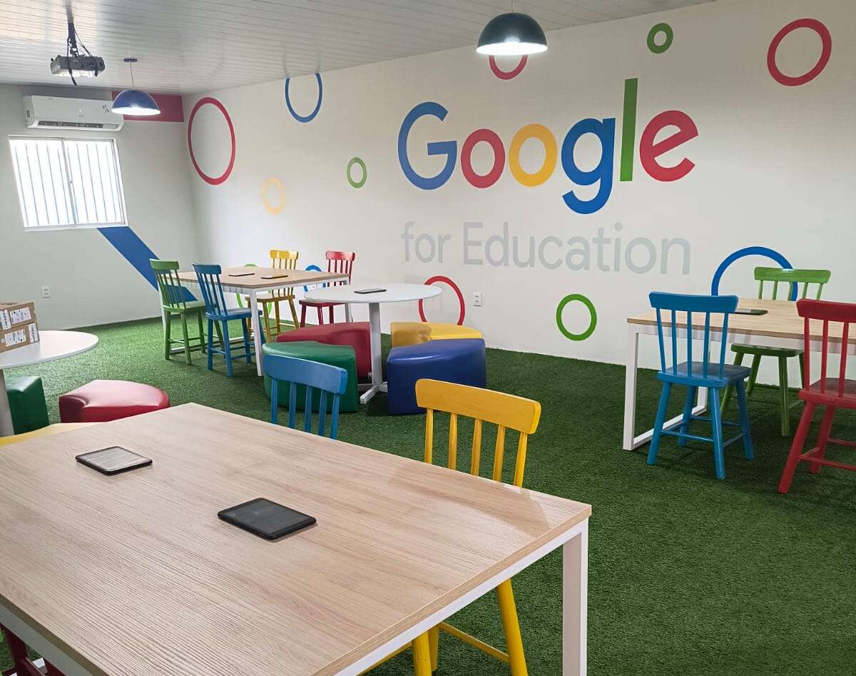 As salas contam com a plataforma Google For Education, que oferece capacitações para professores e acesso a ferramentas como Google Sala de Aula, Gmail, Chat, Drive, Documentos, Planilhas e Apresentações.